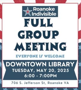Join us this Tuesday May 20th at 6:00PM in the auditorium of the Roanoke Public Library, 706 S Jefferson St, Roanoke, VA 24016, to plug directly into the work of organizing with Roanoke Indivisible and making change!